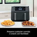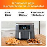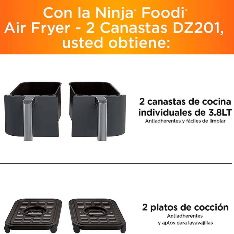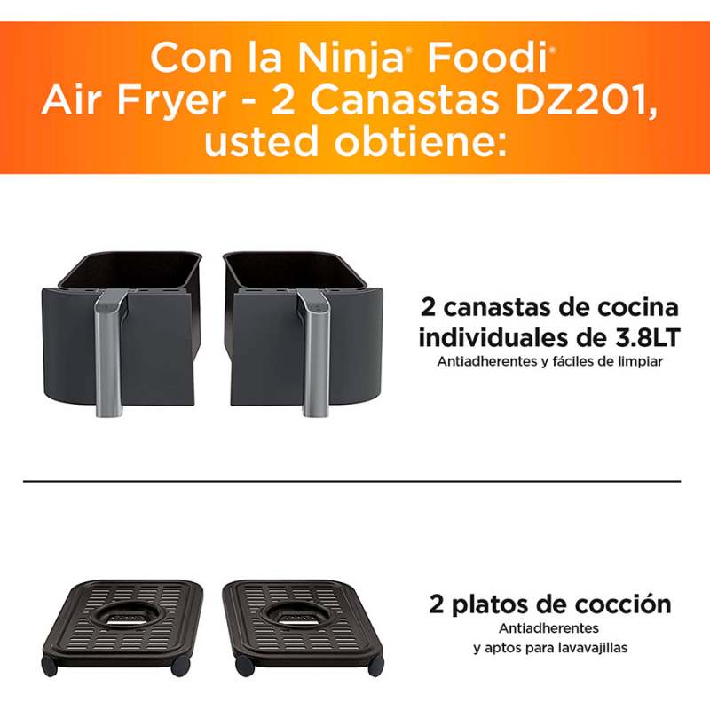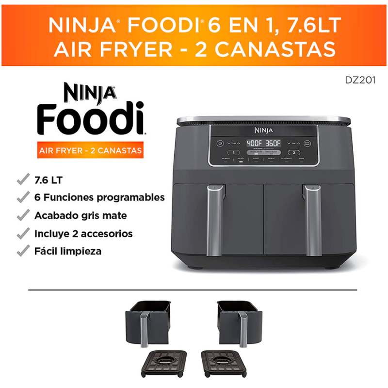 La Freidora de aire Ninja con dos canastas independientes de 3.8 Lt cada una , le permite cocinar dos alimentos a la vez, controlando de manera independiente los ajustes de cada canasta , gracias a la tecnologia DualZone™ que permite establecer diferentes temperaturas y tiempos para terminar la coccion al mismo tiempo.Tiene 6 funciones de coccion: Freir,Dorar,Asar , Hornear,Recalentar y Deshidratar. Cuenta con 2 canasta y dos platos de coccion extraibles, con recubrimeinto en antiadherente. Amplio rango de temperatura: 105°F a 450°F (40.5 °C a 232°C) para preparar infinidad de platos Características destacadas Dos canastas de cocción independientes Capacidad de 7.6 Lt (3.8 LT cada canasta) Controles y pantalla digital Amplio rango de temperatura de 105 °F a 450 °F Tecnologia Dual Zone (diferentes temperaturas y tiempos)