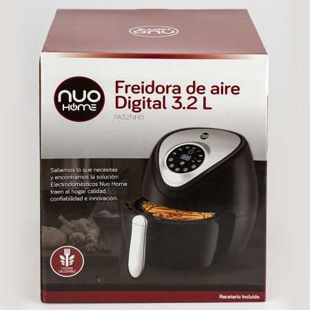 La Freidora de Aire Digital Nuo Home 3.2 Litros Negra FA3.2NHD es la herramienta perfecta para quienes buscan una forma más saludable de disfrutar sus comidas favoritas. Con una capacidad de 3.2 litros, esta freidora es ideal para preparar porciones generosas de alimentos crujientes y deliciosos con hasta un 85% menos de grasa, gracias a su tecnología de circulación de aire caliente. Equipada con una pantalla digital fácil de usar, puedes seleccionar entre una variedad de ajustes de temperatura y tiempo para obtener resultados perfectos en cada preparación. Su diseño elegante en color negro no solo complementa cualquier cocina, sino que también es fácil de limpiar gracias a su canasta desmontable y revestimiento antiadherente. Características clave: Capacidad: 3.2 litros, ideal para familias pequeñas o medianas.Pantalla digital: Permite un control preciso de temperatura y tiempo.Tecnología de aire caliente: Cocina con hasta un 85% menos de grasa.Diseño elegante: Acabado en negro que se adapta a cualquier estilo de cocina.Fácil de limpiar: Canasta desmontable y revestimiento antiadherente.Versatilidad: Perfecta para freír, hornear, asar y tostar.