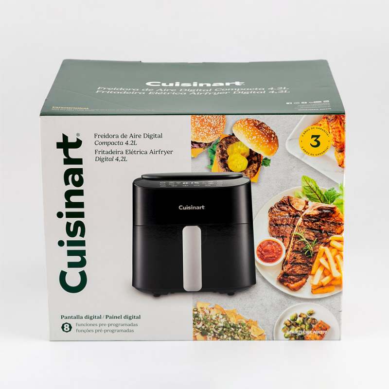 La freidora de aire digital compacta AIR370BRFP de Cuisinart® es una solución versátil para cocinar desde pasabocas hasta platos fuertes de manera saludable, rápida y sin sacrificar la textura crujiente de los alimentos. Su pantalla digital facilita la selección entre 8 funciones preprogramadas o el ajuste manual de temperatura, ofreciendo un rango de 40°C a 220°C. Además, incorpora una notificación sonora que indica cuándo es momento de mover o sacudir los alimentos para asegurar una cocción uniforme.