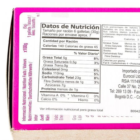 Caja de galletas elaboradas con algodón de maíz, harina de maiz, aceite vegetal, azúcar, jarabe de glucosa, fructosa de maiz, harina de arroz, gastificantes, saly lecitina. Aroma de vainilla. No contiene lactosa. Sin proteínas. Sin frutos secos. Tamaño por ración 6 galletas 30 gramos. Registro Invima RSIA11I14901.