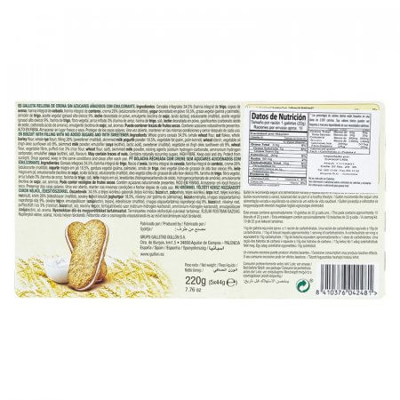 Galleta rellena de crema tipo sándwich. Elaborada con harina de trigo, copos de avena, crema, edulcorante, yogur desnatado y almidón de trigo. Rica en cereales integrales, es un producto alto en fibra que favorece la digestión y el cuidado de la salud. Ideal para incluir en la dieta diaria. Presentación en empaque de 5 unidades. contenido total de 220 g.