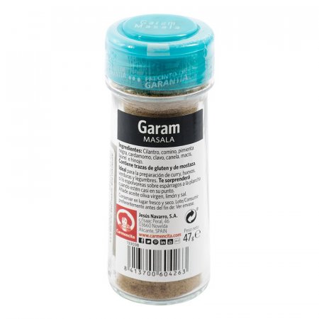Ideal para la preparación de curry, huevos, verduras y legumbres. Ingredientes: Cilantro, comino, pimienta negra, cardamomo, clavo, canela, macis, laurel e hinojo. Te sorprenderá si lo espolvoreas sobre espárragos a la plancha cuando estén casi en su punto. Añade aceite oliva virgen, limón y sal. Contiene trazas de gluten y de mostaza. Medidas en Centímetros: 4x4x12 Conservar en lugar fresco y seco. Registro sanitario RSIA17-69312