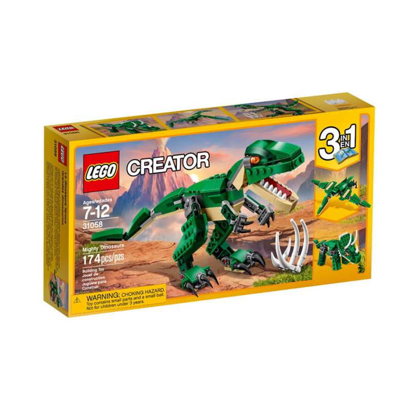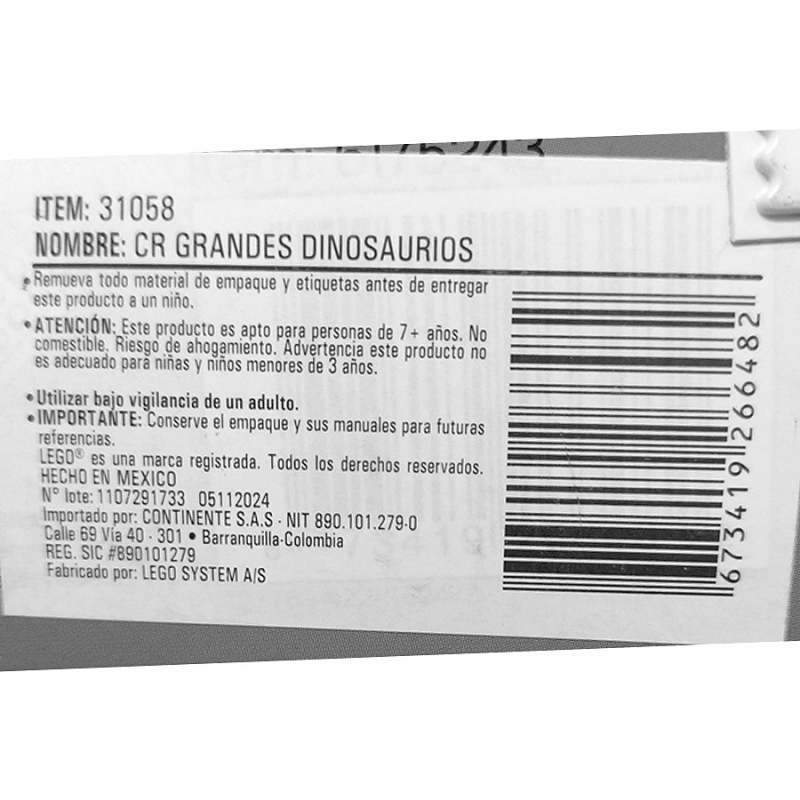 ¡Diviértete con el asombroso T-Rex! Cuenta con una terrorífica combinación de colores en verde oscuro y beige, ojos de color naranja brillante, uniones y cabeza articuladas, grandes garras y boca que se abre con dientes puntiagudos. Incluye también la última presa del dinosaurio (una caja torácica para construir). Convierte este modelo del set LEGO® Creator “3 en 1” Grandes dinosaurios en un triceratops o un pterodáctil. Edad recomendada de uso mayor de 6 años