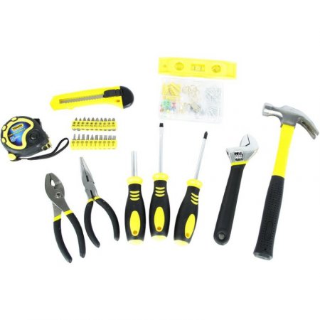 Set x 125 piezas. Ideal para uso en el hogar y carro. Incluye: Martillo 7 Oz, cinta métrica 5 metros. Alicate 2 posiciones 6', pinza punta plana 6'. Llave de expansión 8', nivel torpedo 6'. 1 Destornillador punta plana 4', 1 destornillador phillips 4'. 1 Destornillador adaptador para puntas, 20 puntas para atornillar. Bisturí, bolsa organizadora.