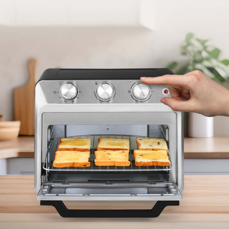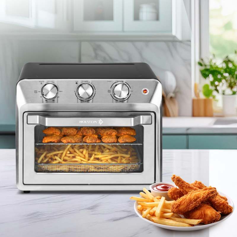 Eleva tu arte culinario con este horno freidora multifuncional de 20 L y 1500 W de potencia Combina funciones de horno tradicional con tecnología de aire caliente para freír sin aceite, ofreciendo resultados crujientes y homogéneos. Incluye control de temperatura, temporizador hasta 60 minutos con apagado automático, accesorios como rejilla, bandeja de migas y cesta de freidora, y puerta de vidrio templado para supervisión del proceso. Ideal para hornear, asar, tostar, recalentar y más.