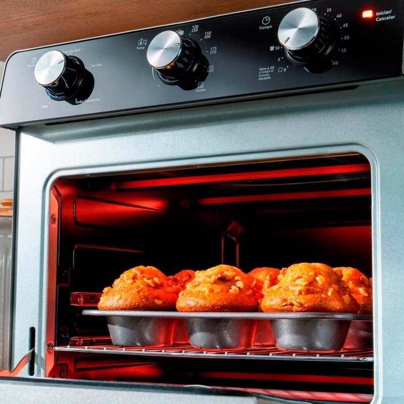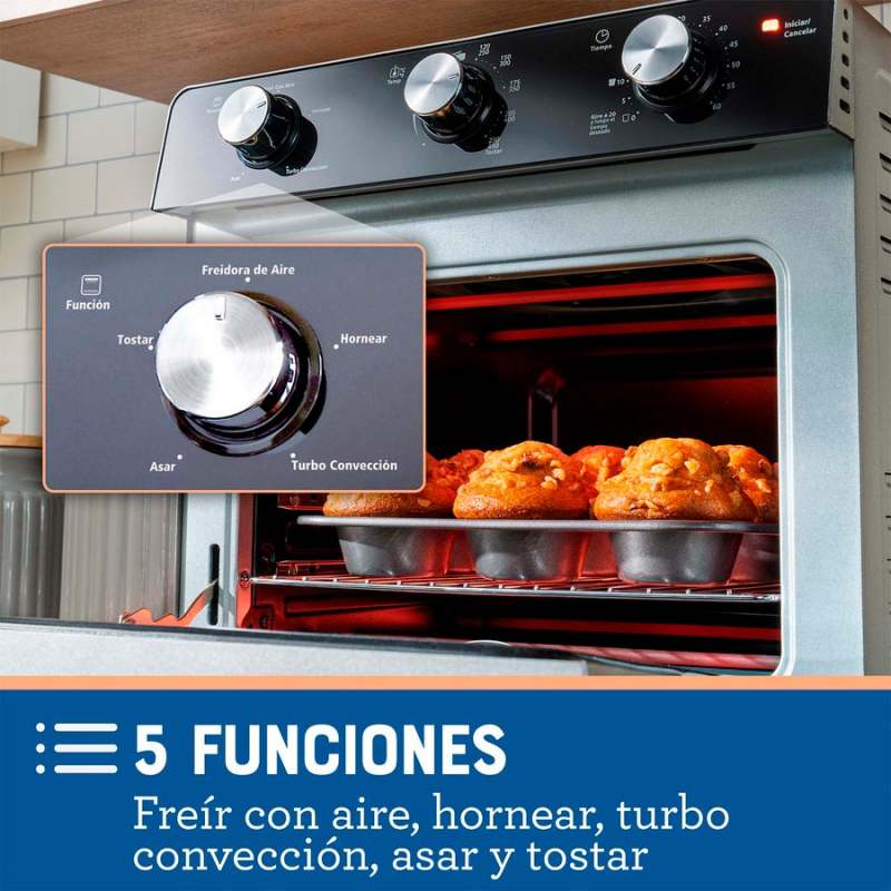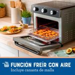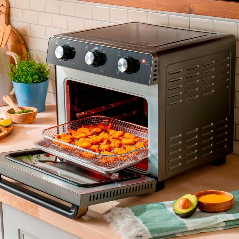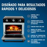 Este horno tostador con función de freidora de aire tiene una capacidad de 22 litros y potencia de 1700 W. Sus dimensiones aproximadas son 42 x 36 x 40 cm. Incluye múltiples funciones de cocción y un recubrimiento antiadherente para facilitar la limpieza. Ideal para hornear, tostar y freír sin aceite.