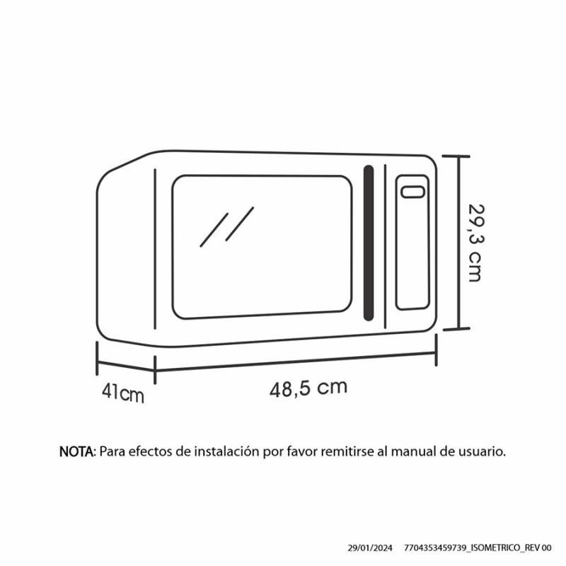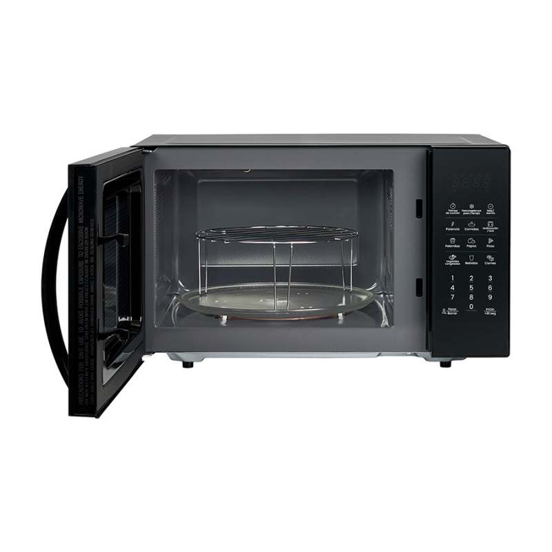 Ajustado a tu necesidad, capacidad de 25 litros.Ahorra tiempo: descongelado por tiempo o peso agiliza preparación.Calor uniforme: cocción eficiente y mejor resultado en tus platos.Fácil limpieza con la protección anti-salpicaduras.Sigue tus recetas fácilmente con la ventana de visualización. Por favor lea completamente estas instrucciones antes de utilizar este horno microondas, así reducirá el riesgo de quemaduras, descargas eléctricas, incendios, lesiones personales o exposición excesiva a la energía de los microondas.