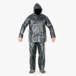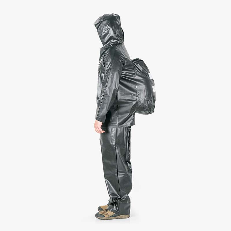 Conjunto impermeable sellado por electro-frecuencia. Chaqueta doble cierre de velcro y cremallera, con fuelles de expansión que hacen espacio al morral y 2 franjas reflectivas en la espalda. Pantalón con resorte en la cintura. Pvc con soporte poliester calibre 16. Contiene 2 piezas chaqueta y pantalón. Reforzado en la zona de las axilas y entrepierna. Color negro. Para uso a la intemperie. Ideal para movilidad en moto, bici o eléctrica.