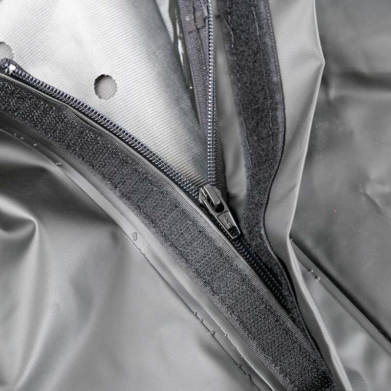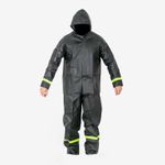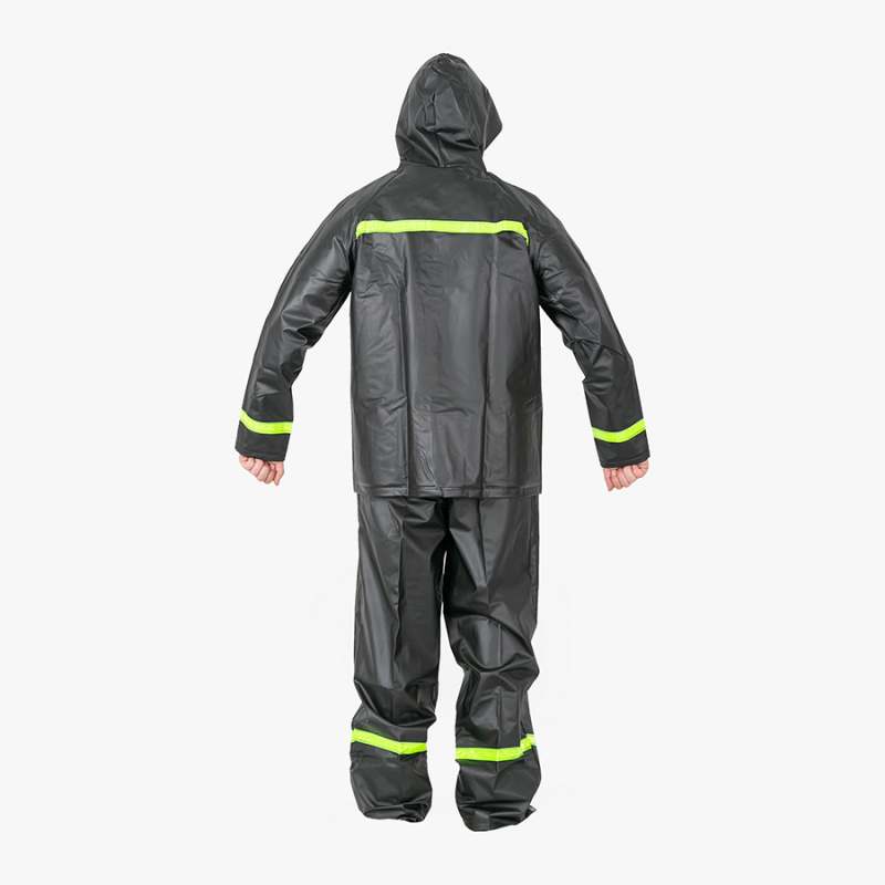 Conjunto impermeable sellado por electro-frecuencia especial para motociclistas. Chaqueta doble cierre de velcro y cremallera, con falsa espalda y perforaciones para ventilación, con franjas reflectivas en espalda y mangas.Con bolsillo interno para el celular. Pantalón con reflectivo en bota-mangas. Pvc con soporte poliester calibre 18. Contiene 2 piezas chaqueta y pantalón. Reforzado en la zona de las axilas y entrepierna. Color negro. Para uso a la intemperie. Ideal para movilidad en moto.