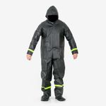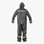 Conjunto impermeable sellado por electro-frecuencia especial para motociclistas. Chaqueta doble cierre de velcro y cremallera, con falsa espalda y perforaciones para ventilación, con franjas reflectivas en espalda y mangas.Con bolsillo interno para el celular. Pantalón con reflectivo en bota-mangas. Pvc con soporte poliester calibre 18. Contiene 2 piezas chaqueta y pantalón. Reforzado en la zona de las axilas y entrepierna. Color negro. Para uso a la intemperie. Ideal para movilidad en moto.