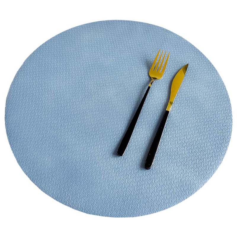Individual diselo redondo elaborado 100% en pvc de color azul claro, viene en juego de 4 piezas. Dimensiones 38cm X 38cm X 0,17cm