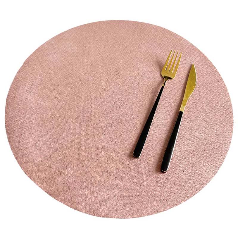 Individual diseño redondo elaborado 100% en pvc de color rose, viene en juego de 4 piezas. Dimensiones 38 X 38 X 0,17 cm. La foto de este producto ha sido ambientada, porque no incluye ningún adorno, ni accesorios, ni piezas adicionales ni ningún otro elemento que lo acompañe.