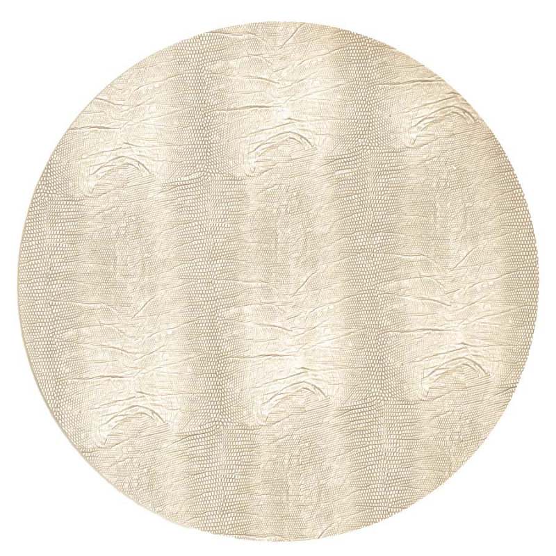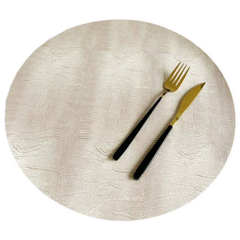Individual diseño redondo elaborado 100% en pvc de color crema, viene en juego de 4 piezas. Dimensiones 38 X 38 X 0,17 cm. La foto de este producto ha sido ambientada, porque no incluye ningún adorno, ni accesorios, ni piezas adicionales ni ningún otro elemento que lo acompañe.