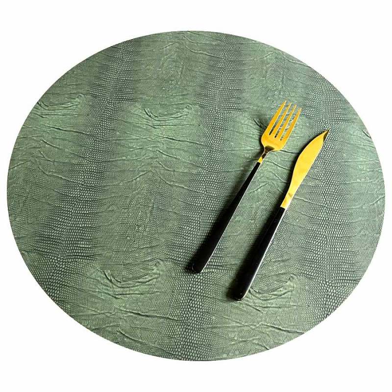 Individual diseño redondo elaborado 100% en pvc de color verde, viene en juego de 4 piezas. Dimensiones 38 X 38 X 0,17 cm. La foto de este producto ha sido ambientada, porque no incluye ningún adorno, ni accesorios, ni piezas adicionales ni ningún otro elemento que lo acompañe.