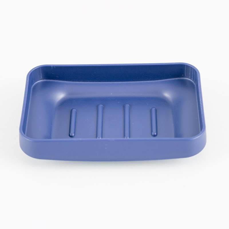 Jabonera de polipropileno en color azul, con dimensiones de 12x2x7 cm, diseño resistente y duradero.