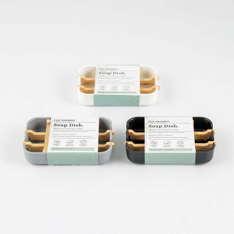 Jabonera eco, hecha de fibra de bambú, con medidas de 12 x 8 cm. Disponible en un surtido de colores, lo que permite combinarla con diferentes estilos decorativos.