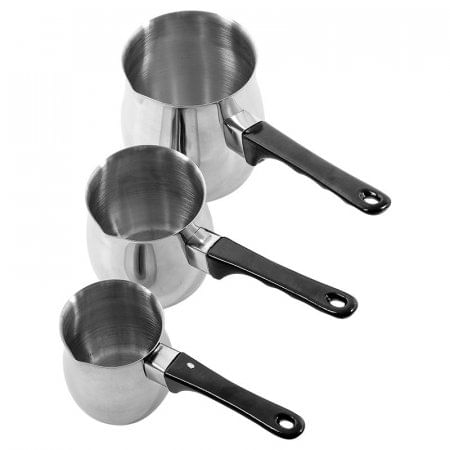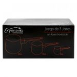 Set de 3 Jarros Acero Inoxidable Expressions Kitchenware Se trata de tu hogar, el principal y único espacio íntimo donde se convive tanto con familiares como con colegas del trabajo o de estudio. Por ello, es costumbre dedicarle una cantidad de tiempo adicional para lograr dar con los mejores productos para así mantenerla: aquellos que reúnen calidad, durabilidad y utilidad. El mejor amigo de cada hogar son todos los productos, herramientas, utensilios o artefactos que permiten realizar más fácil las tareas cotidianas, por otra parte, complementan el estilo y decoración de tu hogar. Los accesorios para tu hogar son importantes para que encuentres confort y seguridad al estar con quienes más amas; es por ello que debes asegurarte de tener la mejor calidad en cada uno de sus detalles. Este set cuenta con 3 jarros muy practicos ya que poseen una gran capacidad de almacenaje, casi 800 ml de cualquier liquido, por estar hechas de acero inoxidable son capaces de soportar tanto un alto grado de calor como frio, sus mangos de agarre estan diseñados para no lastimar las manos, son aptas para estar en contacto directo con el fuego. La calidad es el principal objetivo de esta marca es cumplir con las buenas prácticas de fabricación de productos cosméticos en cada uno de los procesos desde la recepción del pedido hasta la expedición final, con un departamento de calidad independiente y equipado con los últimos aparatos para el cumplimiento de las especificaciones de cada uno de los productos fabricados. Set de tres jarros elaborados en acero inoxidable. Superficie lisa. Contraste brillante. Color plateado. Incluye jarro de 24oz de 12 oz y de 6oz. Mangos ergonómicos resistentes al calor. Practicos tamaños. De fácil limpieza. Aptos para quemadores de gas eléctricos halogenos. Resistentes al frío.