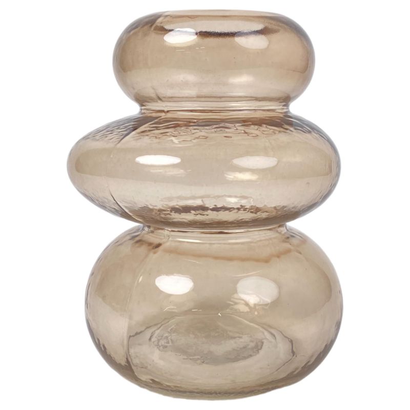 Jarrón Ámbar en vidrio color champagne con silueta redondeada y acabado brillante, medidas 14x18x14 cm, pieza versátil que realza arreglos florales y suma calidez visual a mesas, consolas o ambientes decorativos.
