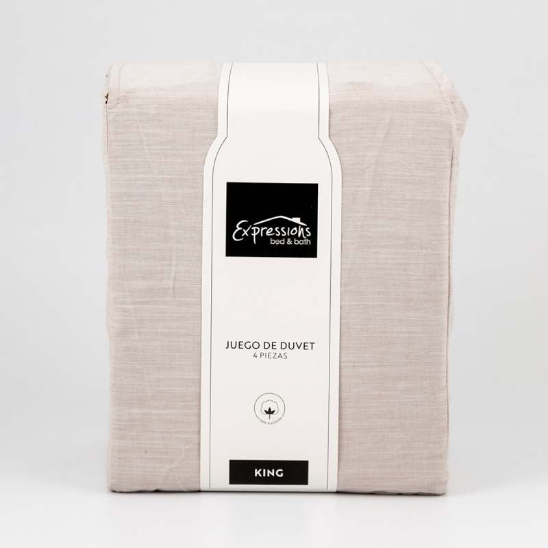 Juego de Duvet Expressions King 200x200 cm en color beige, confeccionado 100% en algodón de alta calidad. Brinda suavidad y confort superior para un descanso profundo y reparador. Su tamaño king es ideal para camas grandes, aportando un estilo elegante y moderno al dormitorio. Producto durable, fácil de cuidar y perfecto para quienes buscan calidad y comodidad en textiles para el hogar.