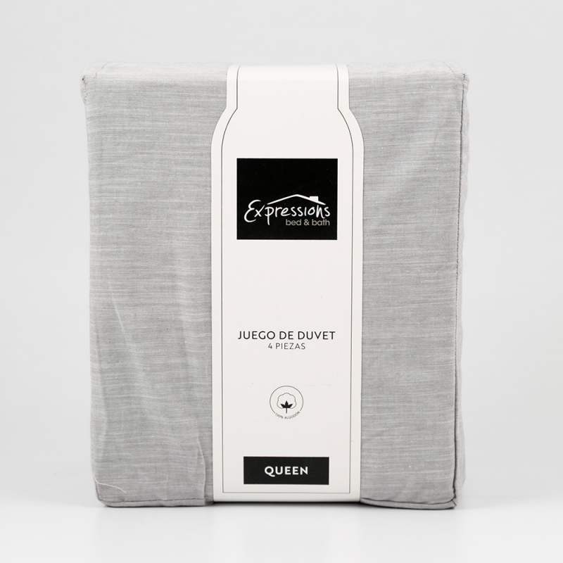 Juego de Duvet Expressions Queen 190x160 cm en color gris claro, confeccionado 100% en algodón de alta calidad. Ofrece suavidad y confort para un descanso óptimo. Su tamaño queen es perfecto para camas grandes, aportando elegancia y frescura al dormitorio. Producto durable y de fácil cuidado, ideal para quienes buscan calidad y estilo en textiles para el hogar.