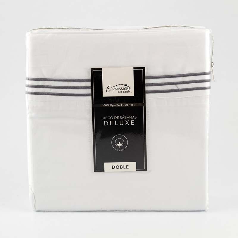 Juego de sábanas 100% algodón 300 hilos 4 Piezas Expressions blanco tamaño doble, incluye: 1 sábana ajustable + 1 sábana plana + 2 fundas de almohada