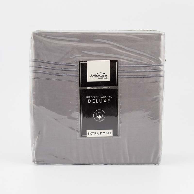 Juego de sábanas 100% algodón 300 hilos 4 Piezas Expressions gris tamaño queen, incluye: 1 sábana ajustable + 1 sábana plana + 2 fundas de almohada