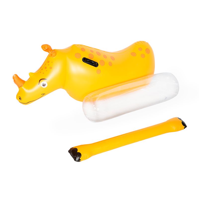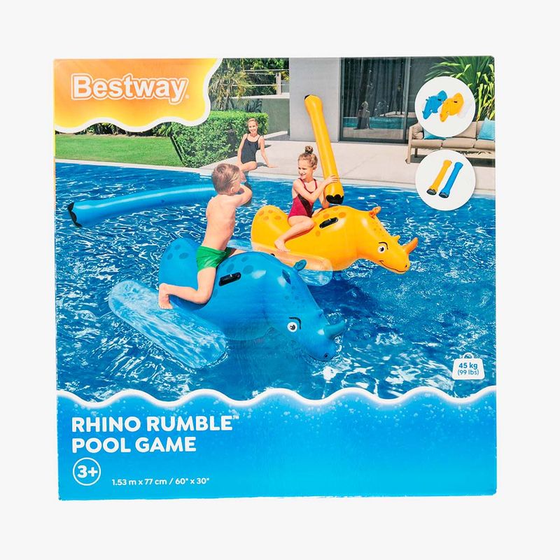 2 flotadores de rinocerontes 2 lanzas de batalla para desequilibrar a tu oponente Asas resistentes Contenido: 1 juego de piscina, 2 parches de reparación -