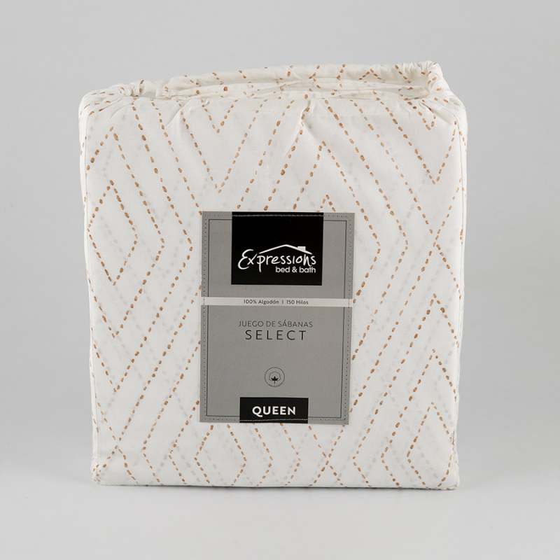 juego de sábanas Expressions Geometric, tamaño Queen, con un diseño geométrico en Taupe. Hecho de 100% algodón, este material es suave, transpirable y cómodo para un sueño reparador. La altura de 150 hilos garantiza una textura suave y duradera, ideal para cualquier decoración de habitación.
