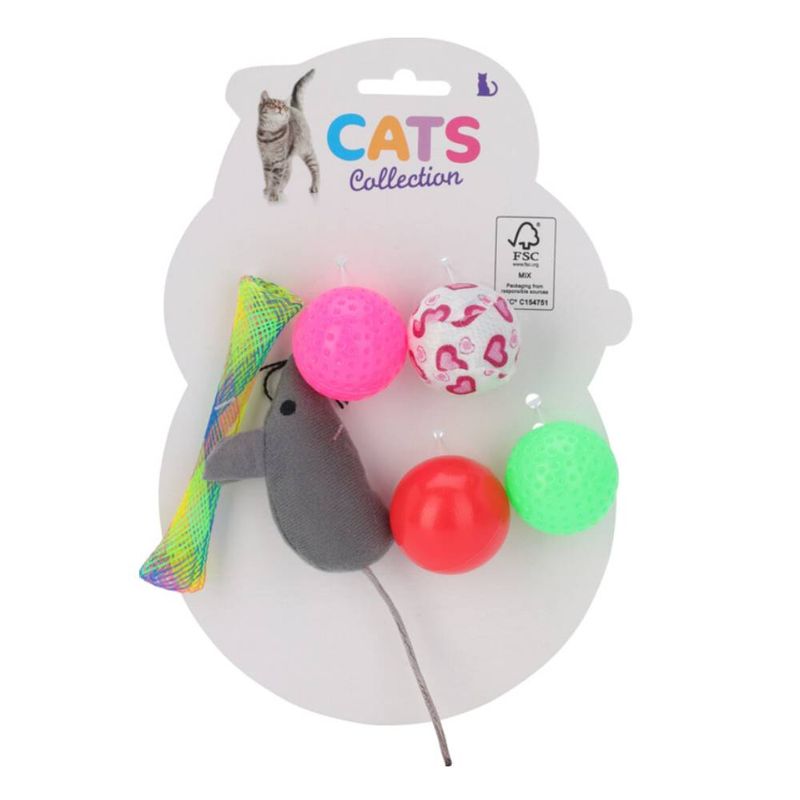 Set de 6 juguetes para gato de Cats Collection, diseñados para mantener al gato activo y entretenido, con colores llamativos y materiales ligeros y seguros.