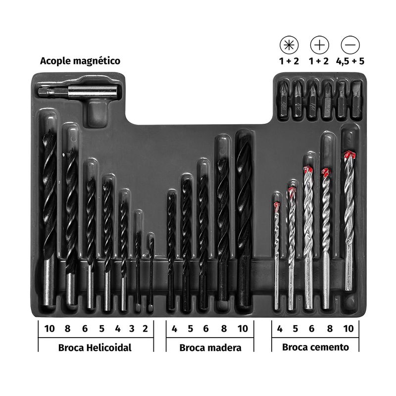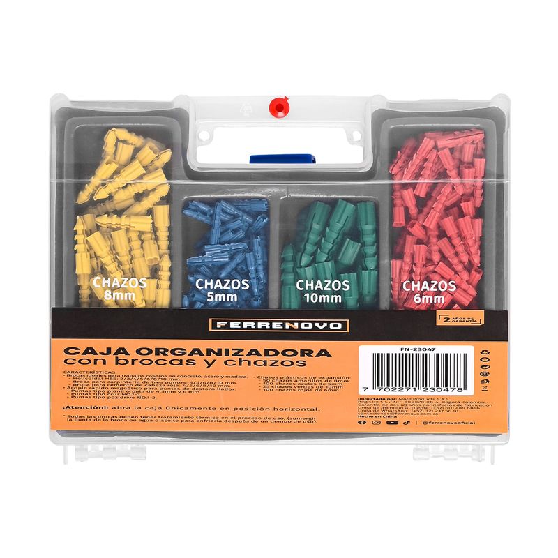 Este kit completo de 300 piezas es perfecto para proyectos domésticos y de bricolaje. Incluye brocas especializadas para madera, metal y muro, ofreciendo versatilidad en tus trabajos. Además, incorpora chazos amarillos para anclaje en paredes, garantizando un resultado seguro y profesional. Viene presentado en un estuche compacto y portátil, ideal para almacenamiento y transporte. ¡Haz tus proyectos más fáciles y organizados con este set esencial!