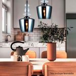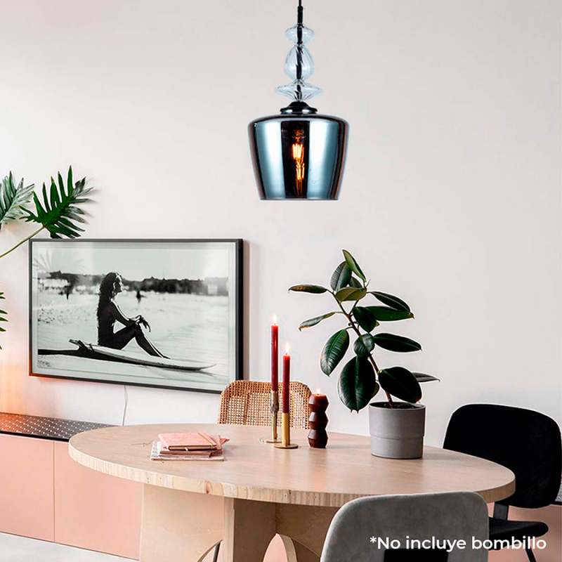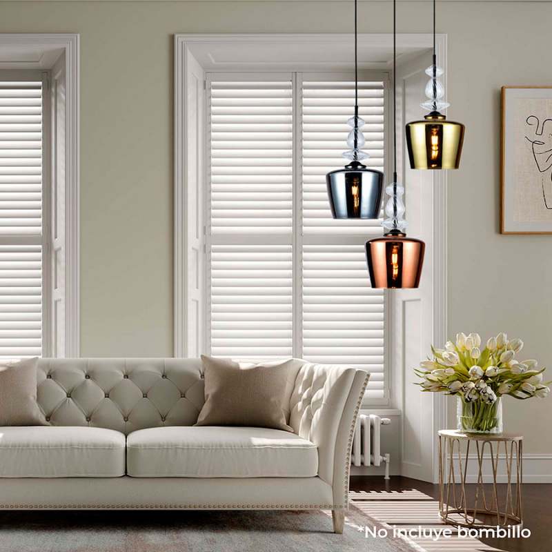 Lámpara Colgante de Vidrio Rosado, Plateado O Dorado En Forma Cilíndrica, Acompañada de 3 Esferas de Vidrio En La Sujeción. Este Producto Cuenta Con Certificación Y Cumplimiento de Reglamentación Retilap.