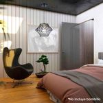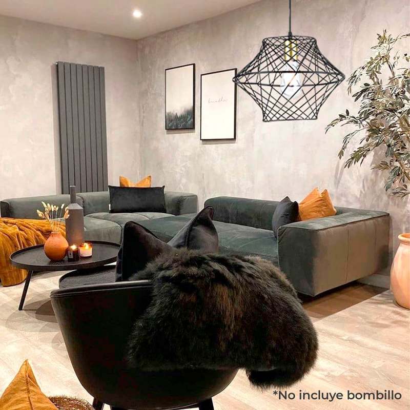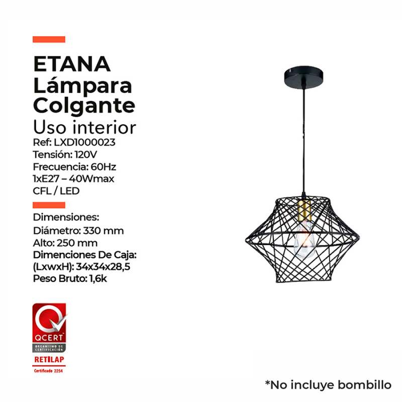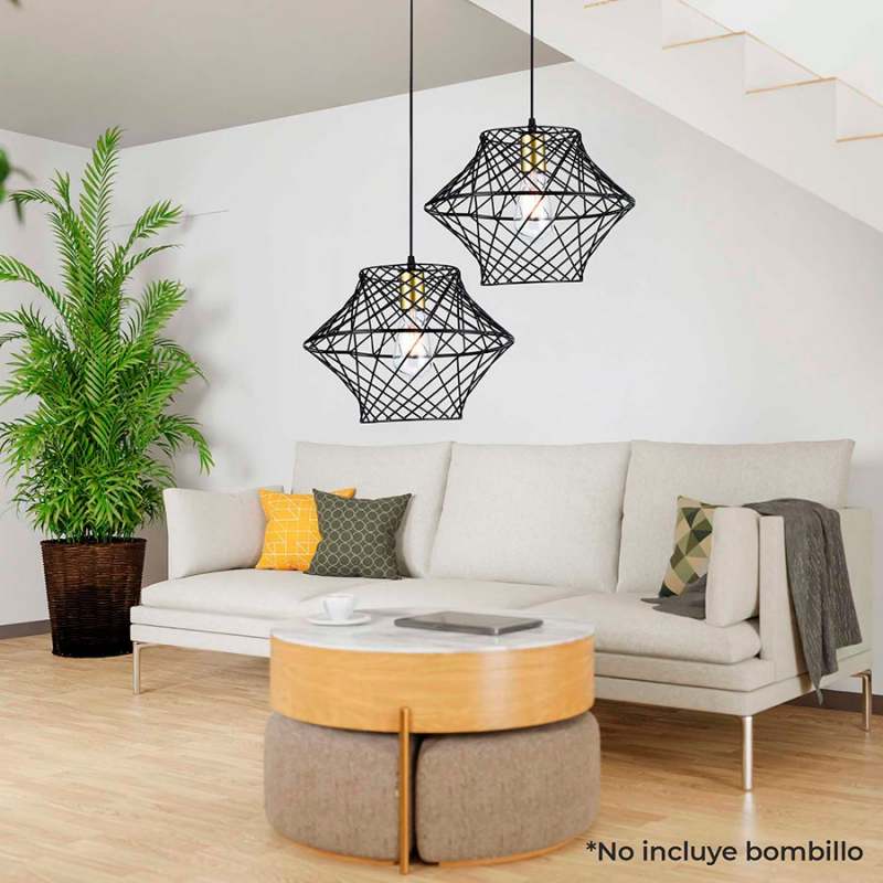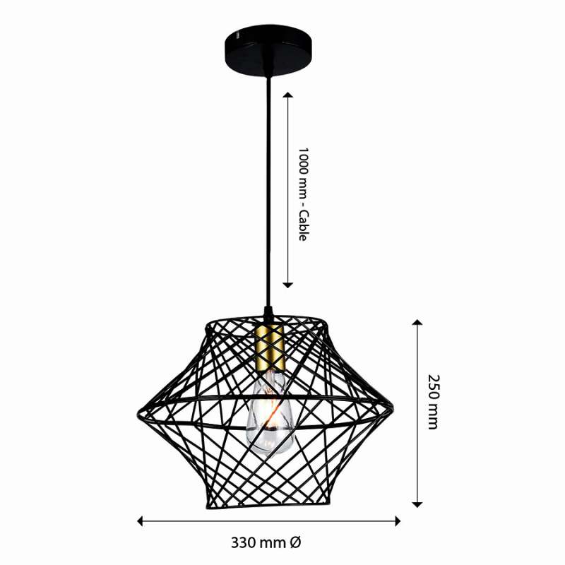 Lampara Colgante de Gran Porte, Rejilla Metálica En Original Forma Geométrica, Color Negro Y Dorado, Uso Sugerido Con Bombillos de Filamentos Led. Este Producto Cuenta Con Certificación Y Cumplimiento de Reglamentación Retilap.