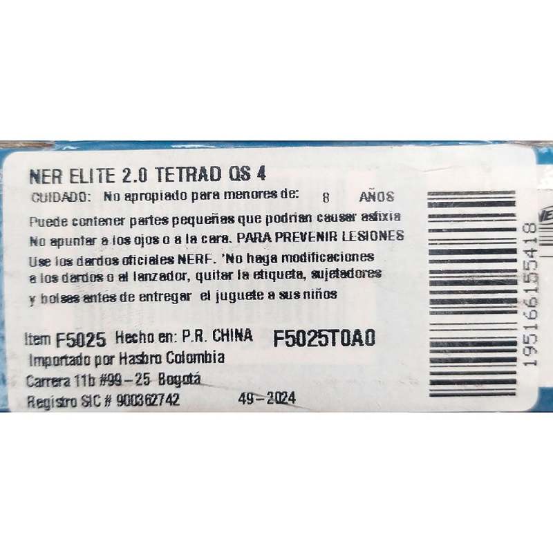 Lanzador Nerf Elite 2.0 Tetrasqs4 / Plástico: Multicolor. Ideal para estimular las habilidades, de competencia de los niños. Contiene: - Lanzador. - 4 Cañones Frontales. - 4 Dardos x cada cañón. - Riel táctico para personalizar. - Culata para mejorar puntería Recomendaciones: *Edad Sugerida: + 8 Años. *No es adecuado para menores de 8. *Utilizar bajo la supervisión de un adulto. * Producto contiene partes pequeñas, no ingerir. *Utilizar los dardos oficiales de la marca..