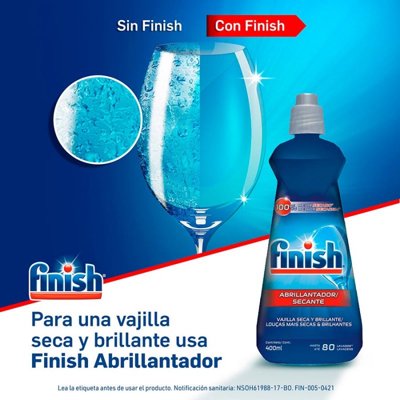Finish Abrillantador tiene 5 Beneficios. Para una vajilla seca y lista para usar, agregue siempre Finish Abrillantador en ciclo de lavado. Con su fórmula Quick-dry, la acción de Finish potencia el proceso secado y ayuda a obtener un brillo increíble.