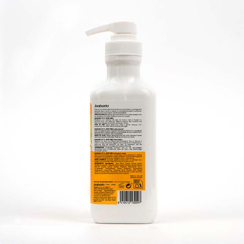 Leche corporal con Vitamina C, Ilumina e hidrata la piel. Su fórmula rica en Vitamina C+ protege de la polución diaria. Ayuda a mejorar la elasticidad de la piel y a estimular la producción de colágeno. Acción antioxidante. Uso sobre la superficie corporal. Aplicar sobre piel sana. Aplicar generosamente con un suave masaje hasta su completa absorción, puede utilizarse día y noche.