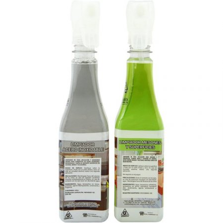 Set x 2. Limpiador de mesones y superficies. Ideal para mármol, granito, quartzone, porcelanato y cerámica. Antibacterial. No requiere enjuague. Elimina grasa y suciedad en general. Actúa contra hongos y bacterias. Contiene 600 ml. Limpiador de acero inoxidable. Formula mejorada. Fácil aplicación y agradable aroma. Desengrasa y limpia al instante superficies en cocinas, baños y accesorios. Contiene 600 cc.