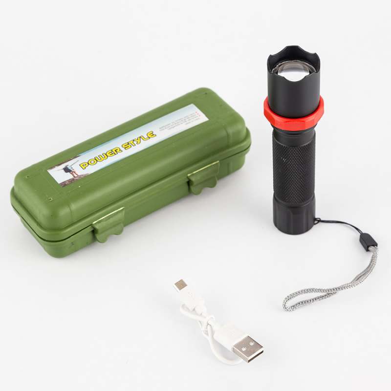 Linterna con estuche verde y entrada USB para cargar la bateria interna, contiene cordon para sostener
