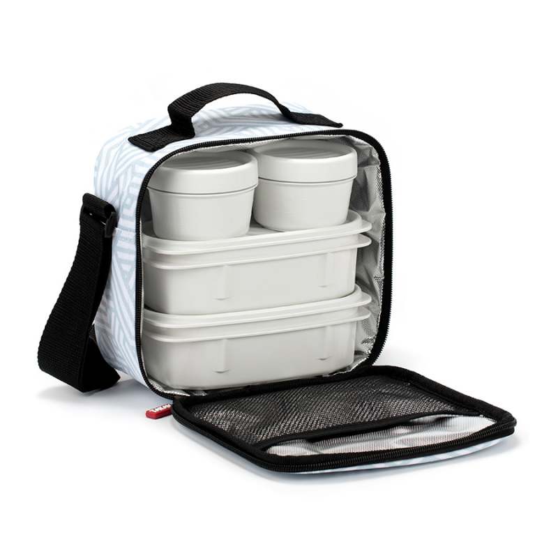 Lonchera Urban Food casual color azul 22 X 10 X 22.5 + 4 contenedores: (Dos ovaladas y Dos redondos); Lonchera térmica porta alimentos con asa superior cargadera extensible. El material textil semi-rígido protege el contenido de posibles impactos a la vez que cuenta con un aislante en el interior que asegura una óptima conservación de los alimentos. Incluye 2 contenedores ovaladas de 0.5L y 2 contenedores redondos de 0.2L de plástico libre de BPA . Estos contenedores son totalmente herméticos y aptos para microondas hasta 100º. En nevera puede aguantar hasta -40%.