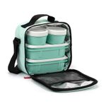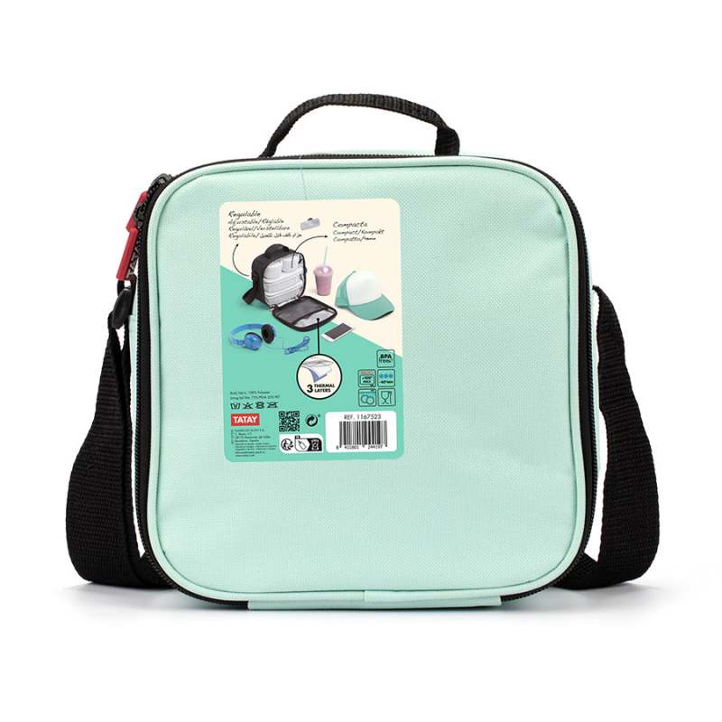 Lonchera Urban Food casual color menta + 4 contenedores:( Dos ovaladas y Dos redondos); Lonchera térmica porta alimentos con asa superior y cargadera extensible. El material textil semirrígido protege el contenido de posibles impactos a la vez que cuenta con un aislante en el interior que asegura una óptima conservación de los alimentos. Incluye 2 contenedores ovaladas de 0.5L y 2 contenedores redondos de 0.2L de plástico libre de BPA . Estos contenedores son totalmente herméticos y aptos para microondas hasta 100º. En nevera puede aguantar hasta -40%.