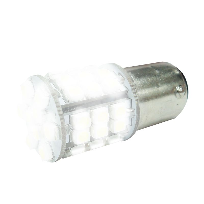 Luz led para automóvil de color blanca, con 2 modos de iluminación, alto brillo y brillo bajo. Integra 45 piezas Led de tipo SMD 3528 y socket BA15S. Potencia de 1,5 watts.