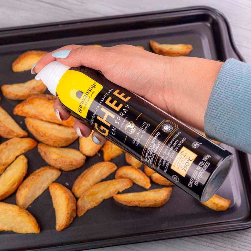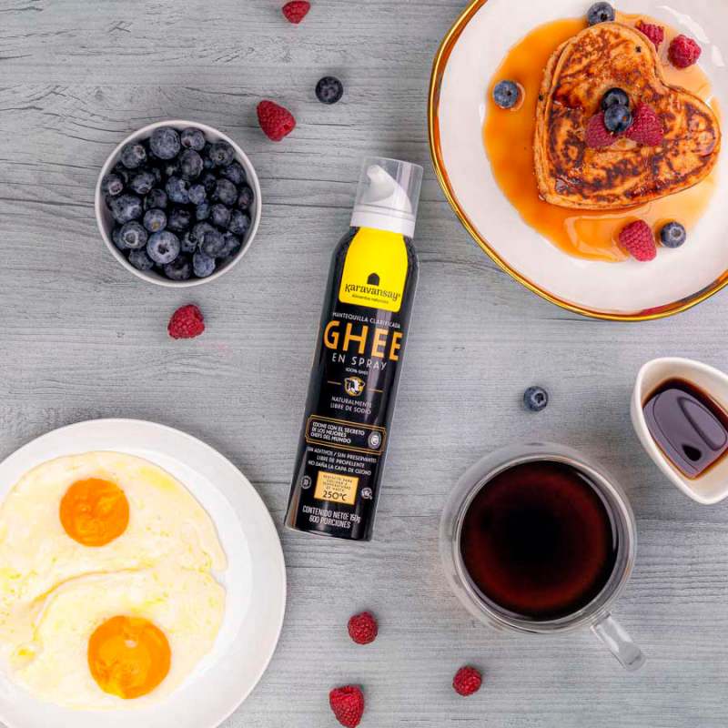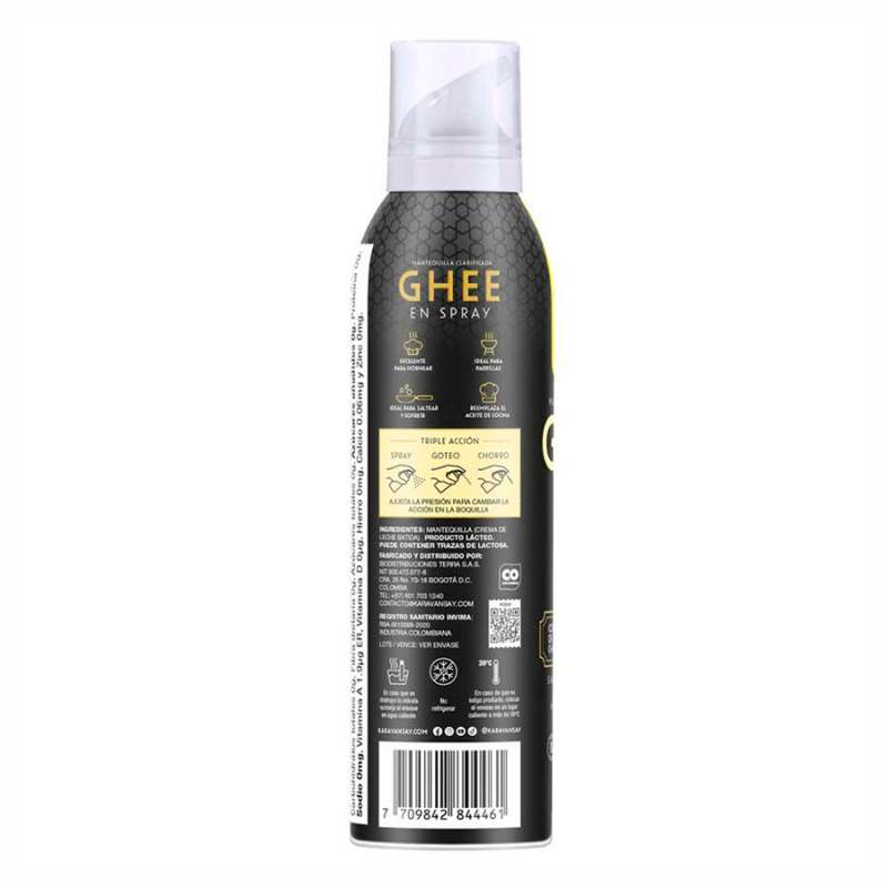 La mantequilla clarificada gheeen spray es ideal para cocinar sin exceso de grasa. Deja hasta un 995 menos de residuos. Formas de Uso: Engrasar moldes;Ideal para Airfryer. Alto punto de humo 250°c. Triple filtrado. No requiere refrigeración. Naturalmente libre de sodio. Cuenta con tecnología de aire comprimido (BOV) No contiene propelentes químicos. No es inflamable ni tóxico. No daña la capa de ozono.