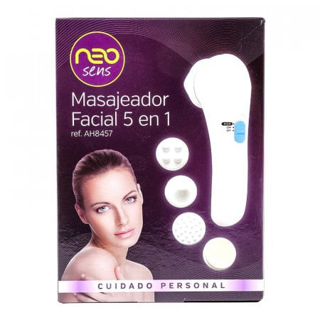 Masajeador Facial Neo Sens. Este Masajeador facial con función 5 en 1 es ideal para cuidar el rostro, te ayuda a reducir el tamaño de los poros, reduce y borra las arrugas o lineas de expresión finas, afirma la piel y da tono a los músculos faciales, reduce las imperfecciones causadas por el daño solar. El masajeador esta elaborado en pasta, funciona con dos baterías AA, tiene dos velocidades. Incluye esponja de limpieza, masajeador relajante multipropósitos, masajeador de cuatro puntos, masajeador lotus y masajeador de punta.
