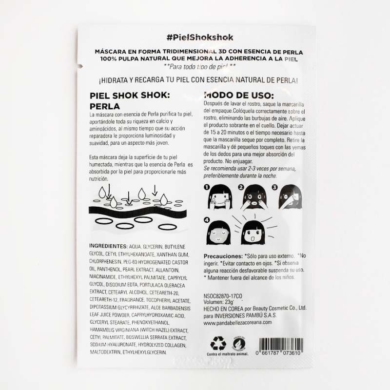 La máscara con esencia de Perla purifica tu piel, aportándole toda su riqueza en calcio y aminoácidos, al mismo tiempo que su acción reparadora le proporciona luminosidad y suavidad, para un aspecto más joven. Esta máscara deja la superficie de tu piel humectada, mientras que la esencia de perla y aloe es absorbida por la piel para proporcionarle más nutrición. Después de lavar el rostro, saque la mascarilla del empaque. Colóquela correctamente sobre el rostro, eliminando las buburjas de aire. Aplique el producto sobrante en el cuello. Dejar actuar durante 15 minutos. Retire la mascarilla y dé pequeños toques con las yemas de los dedos para una mejor absorción del producto. No enjuagar.