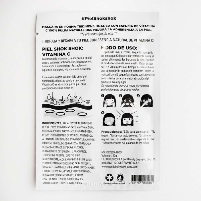 La esencia de vitamina C le aportará a tu piel cuatro acciones: antioxidación, regeneración, hidratación e iluminación. Esta máscara deja la superficie de tu piel humectada, mientras que el ácido ascórbico te ayuda a eliminar impurezas y la esencia de Aloe es absorbida por la piel para proporcionarle más nutrición. Después de lavar el rostro, saque la mascarilla del empaque. Colóquela correctamente sobre el rostro, eliminando las buburjas de aire. Aplique el producto sobrante en el cuello. Dejar actuar durante 15 minutos. Retire la mascarilla y dé pequeños toques con las yemas de los dedos para una mejor absorción del producto. No enjuagar.
