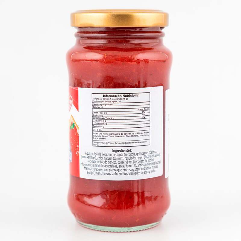 Mermelada de fresa con trozos de fruta, sin azúcar adicionada. Endulzada con Stevia. Elaboradas con frutas frescas y maduras, 100% colombianas. Exquisitas para esparcir sobre pan, tostadas y galletas. Complemento de desayunos nutritivos y deliciosas recetas. 75% menos calorías. Excelente para cubrir o rellenar nuestras tortas de Vainilla, Casera de Límón o Naranja. Apto para personas que no pueden o no desean consumir azúcar. Compatible para personas diabéticas, dentro de las restricciones de una dieta con supervisión médica.