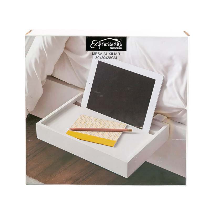 Mesa Auxiliar Expressions 30X20X28Cm Blanco Mdf Ge10D 00026 Perfecta para literas superiores o espacios reducidos, esta repisa se desliza sobre el marco de la cama para tener a mano el teléfono, una bebida o tu libro favorito. Elaborado artesanalmente por expertos en MDF con un acabado aplicado a mano. Perfecto para libros y revistas o para tener dispositivos a mano. El estante se sostiene por sí solo y se sujeta al lateral de la estructura de la cama. Importado.