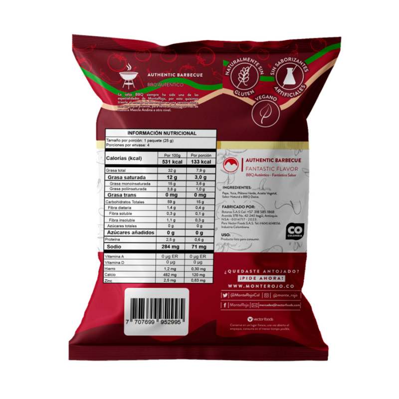 Irresistibles chips crocantes de papas gruesas y rústicas, plátanos verdes y yucas, con nuestro inconfundible sabor BBQ dulce. Cada bolsa de 100g te garantiza frescura y conveniencia para disfrutar en cualquier momento. Experimenta el sabor que no podrás resistir y descubre el maridaje perfecto. Es un producto sin azucar añadido, sin conservantes artificiales, sin grasas trans, sin colesterol y libre de gluten.