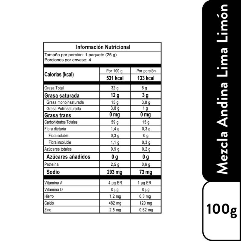 Irresistibles chips crocantes de papas gruesas y rústicas, plátanos verdes y yucas, con nuestro inconfundible sabor lima limón. Cada bolsa de 100g te garantiza frescura y conveniencia para disfrutar en cualquier momento. Experimenta el sabor que no podrás resistir y descubre el maridaje perfecto. Es un producto sin azucar añadido, sin conservantes artificiales, sin grasas trans, sin colesterol y libre de gluten.