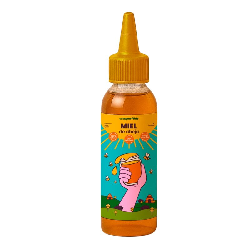 Miel natural EL SUPER MUNDO elaborada por abejas a partir del néctar de flores, sin aditivos ni conservantes artificiales. Presenta un sabor dulce, aroma floral y tono ámbar variable según la floración. Reconocida por sus propiedades antiinflamatorias y beneficios para la salud.