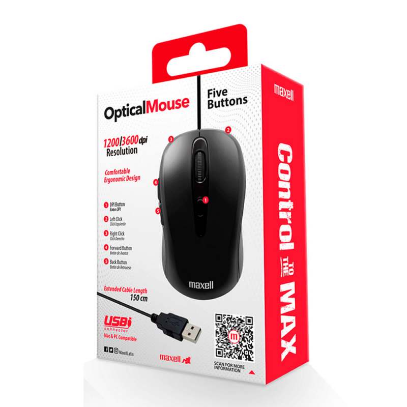 Mouse óptico de 5 botones, Resolución de 1200/1600 DPI5 botones para máximo confort: Botón DPI, click izquierdo, derecho, avance y retrocesoDiseño curvo cómodo ergonómicoTextura anti resbalanteEmpuñaduras laterales para dedosEntrada conector USBLargo del cable: 150 cmsCompatible con MAC y Windows